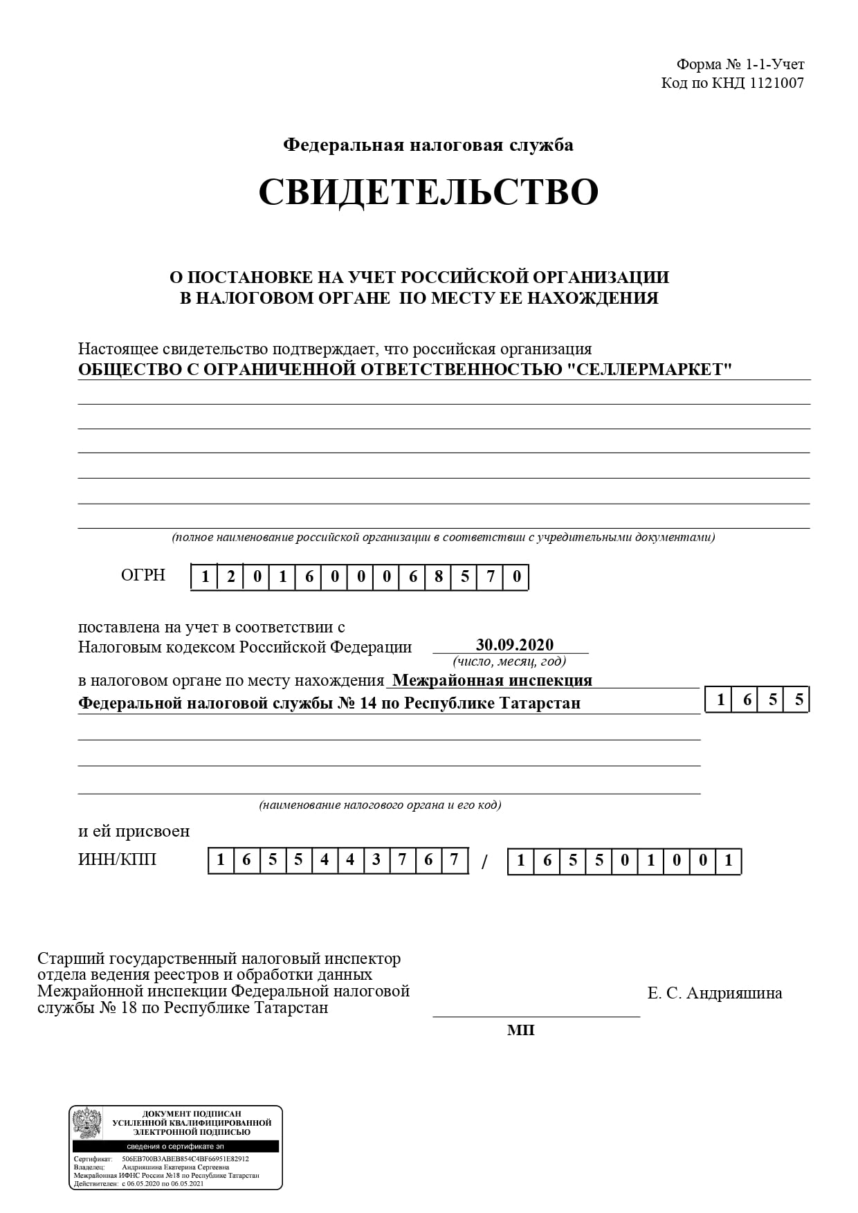 SellerMARKET LLC (PSRN: 1201600068570, ITN: 1655443767)