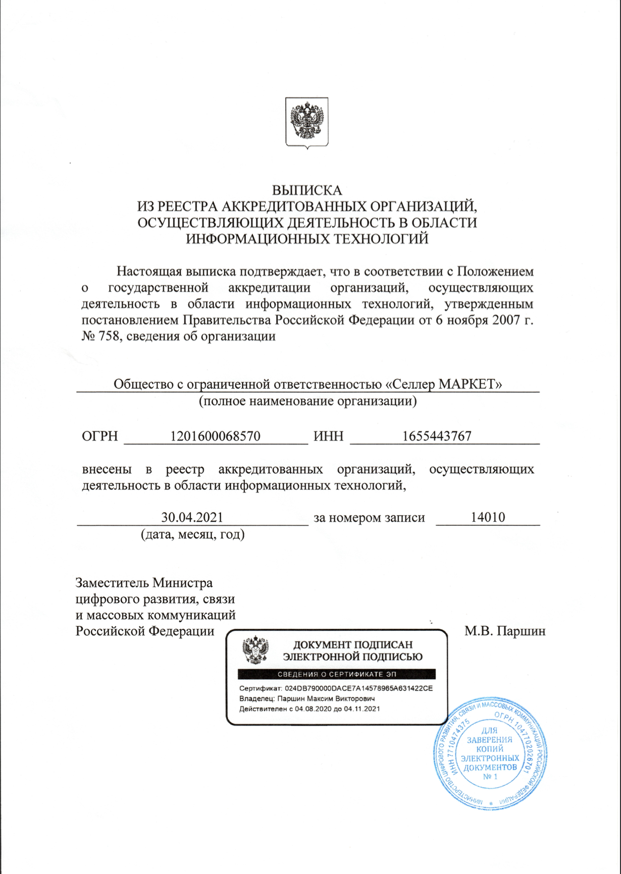 - Accreditation in Ministry of Digital Development, Communications and Mass Media of Russian Federation (№ 14010 от 30.04.2021)