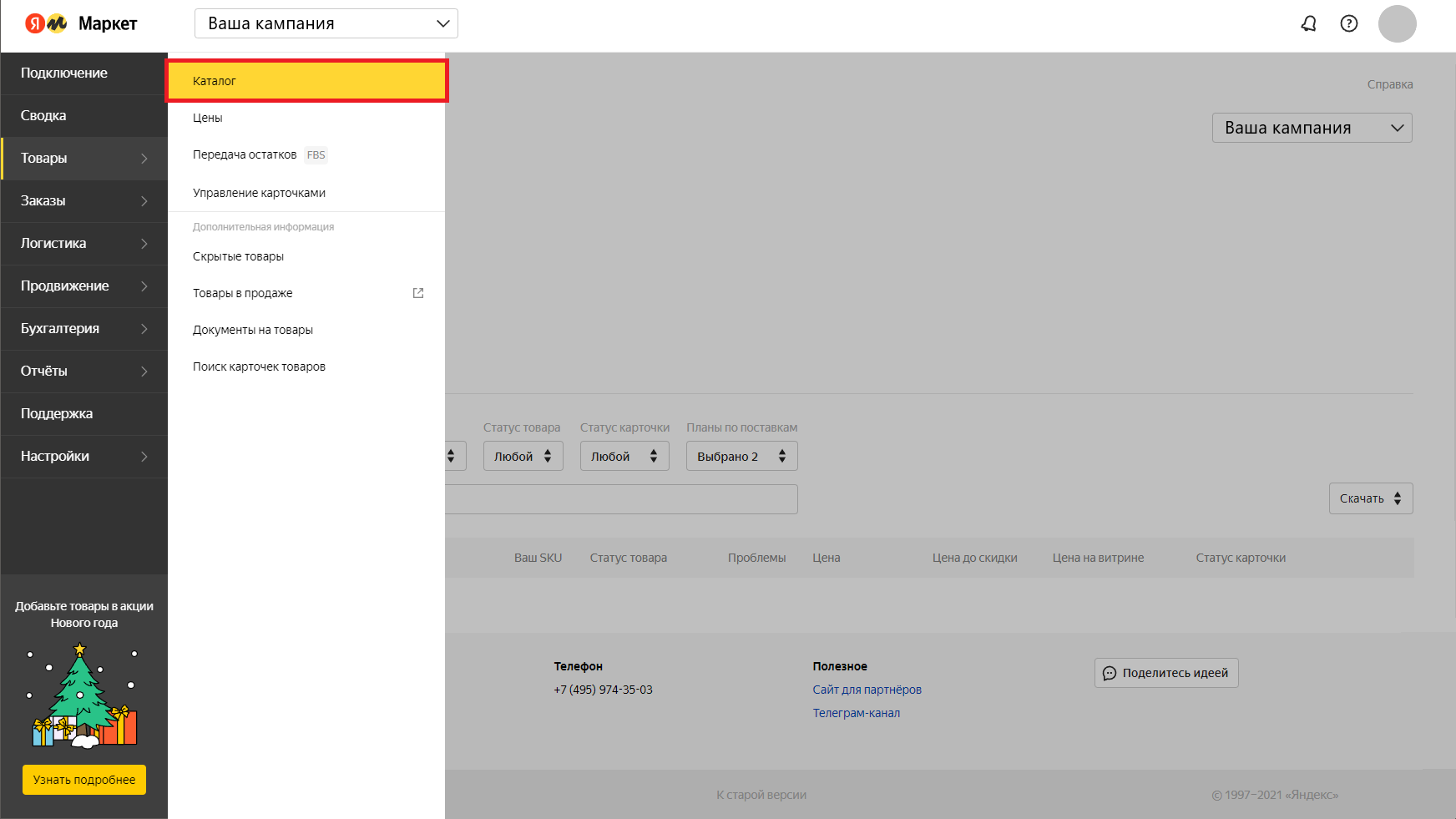 В личном кабинете Яндекс.Маркета, перейдите во вкладку Товары -> Каталог.