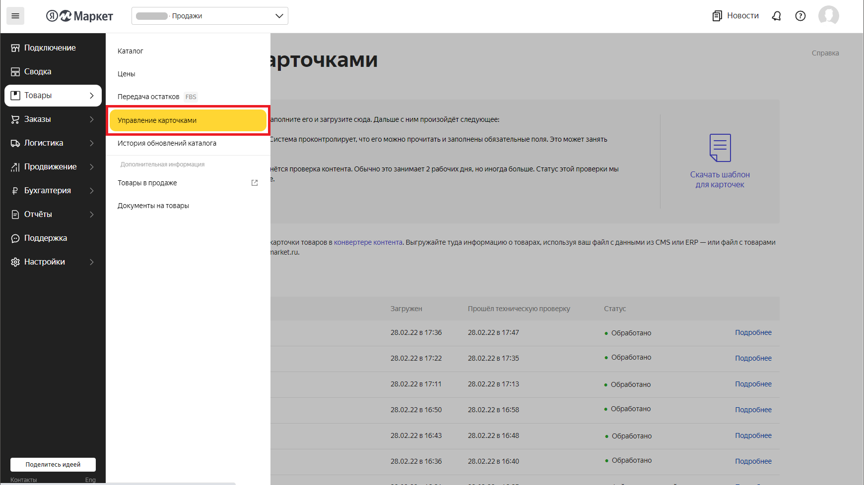 Загружаем XLSX-файл с карточками и характеристиками продуктовПосле того как перенос каталога завершится, можно по требующимся продуктам создать карточки. Для этого в личном кабинете Яндекс.Маркета, перейдите во вкладку Товары -> Управление карточками.
