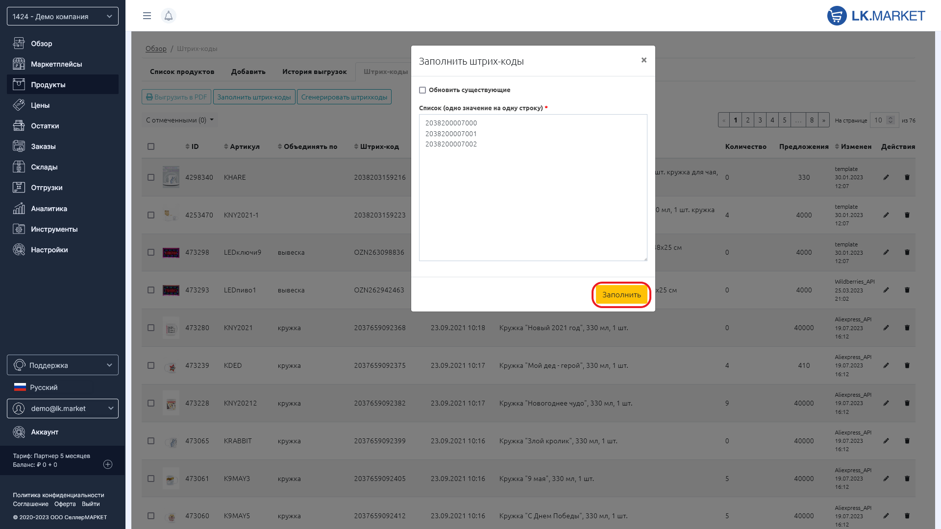 В открывшемся окне вставьте список ШК (одно значение на одну строку) и нажмите на кнопку "Заполнить".