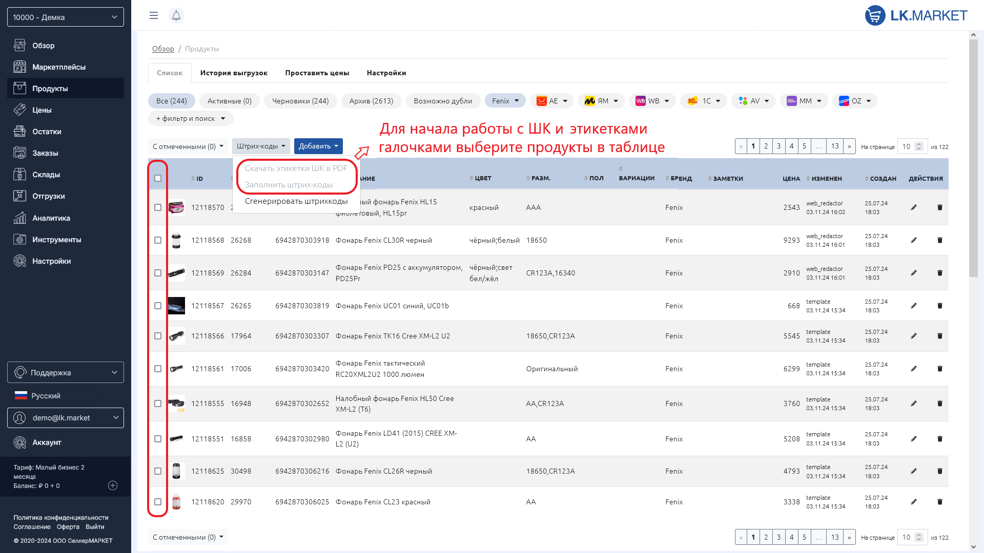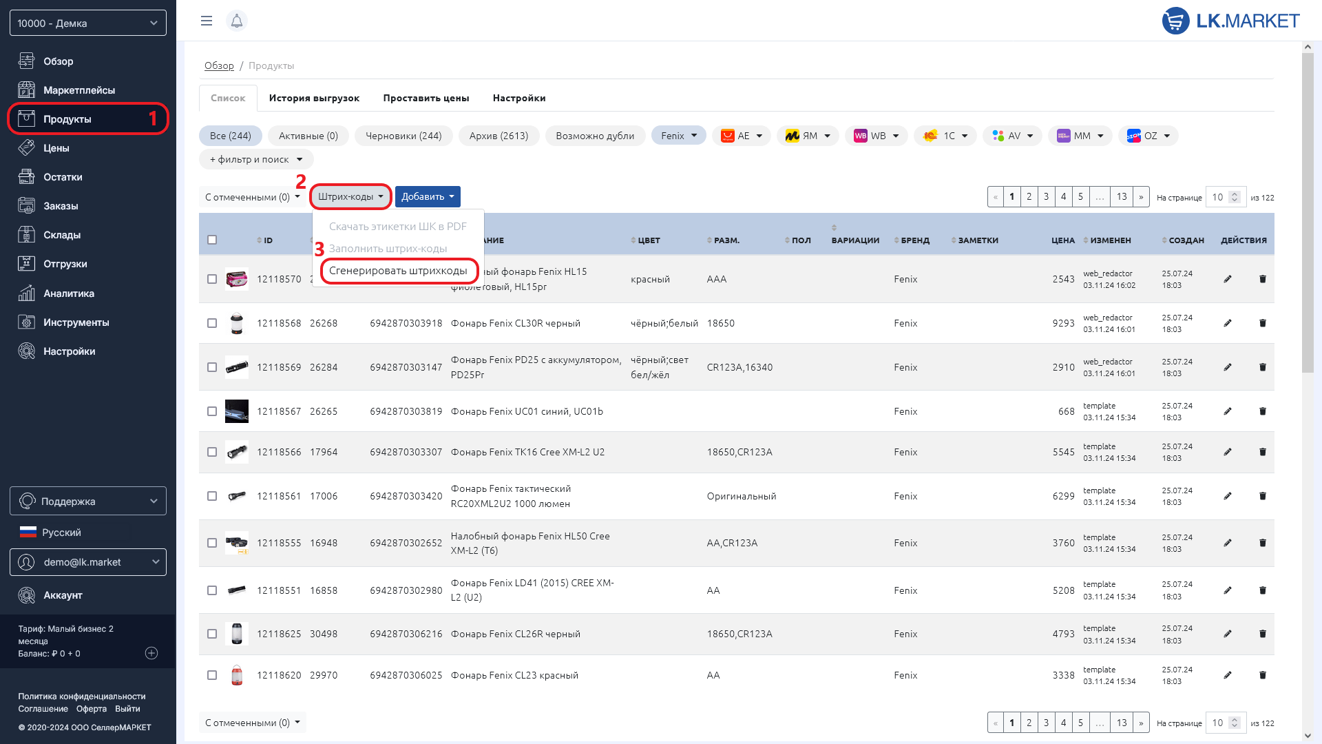 Платформа LK.MARKET позволяет массово и поштучно генерировать уникальные ШК под разные маркетплейсы, устанавливать их в товарные карточки, по клику формировать этикетки с баркодами (полоски и числа) и заполнеными характеристиками товаров, выгрузить их в ленту PDF для печати и дальнейшей работы с ними. Размеры, форматы и вид этикеток представления можно выбирать из предустановленных.