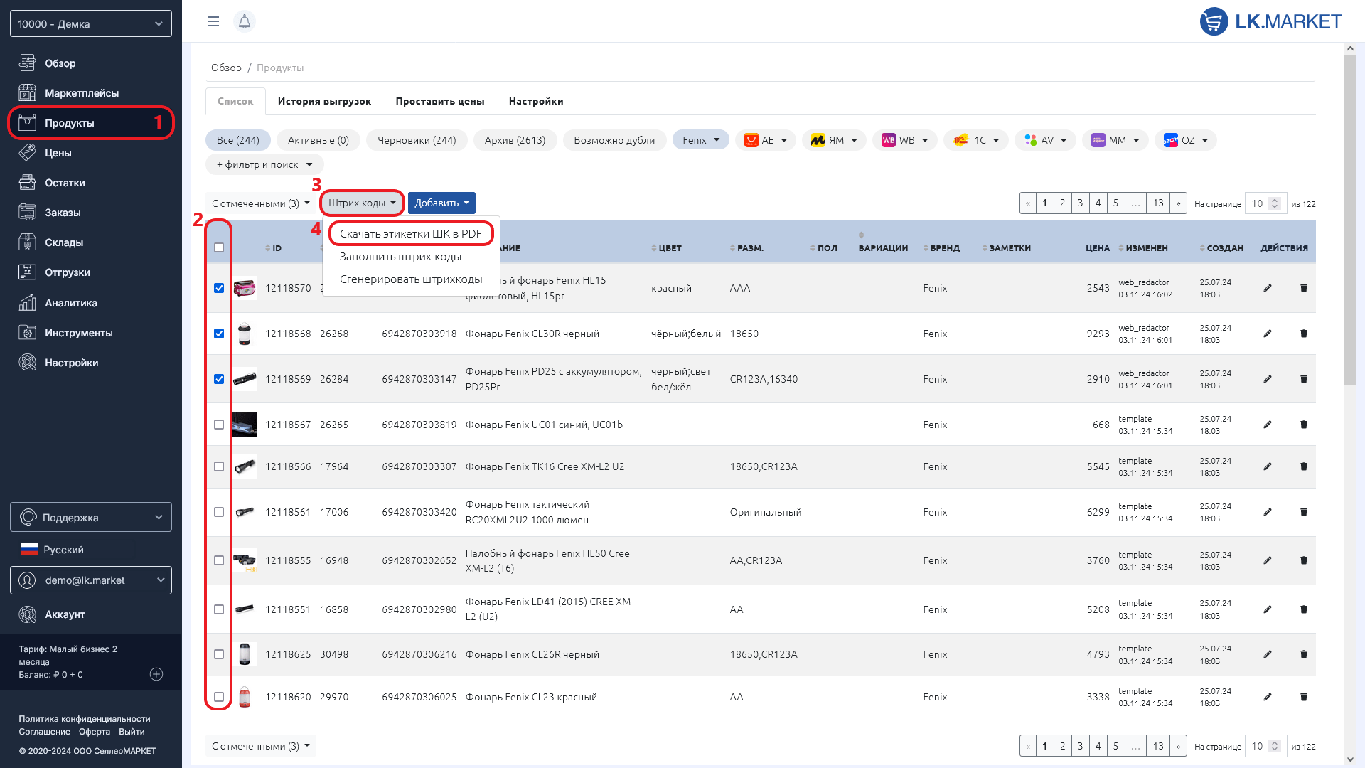 Затем галочками в таблице выберите (2) разом все (верхняя галочка) или поштучно продукты, с которыми предстоит работать. Далее жмем "Штрих-коды (3) > Скачать этикетки ШК в PDF (4)".